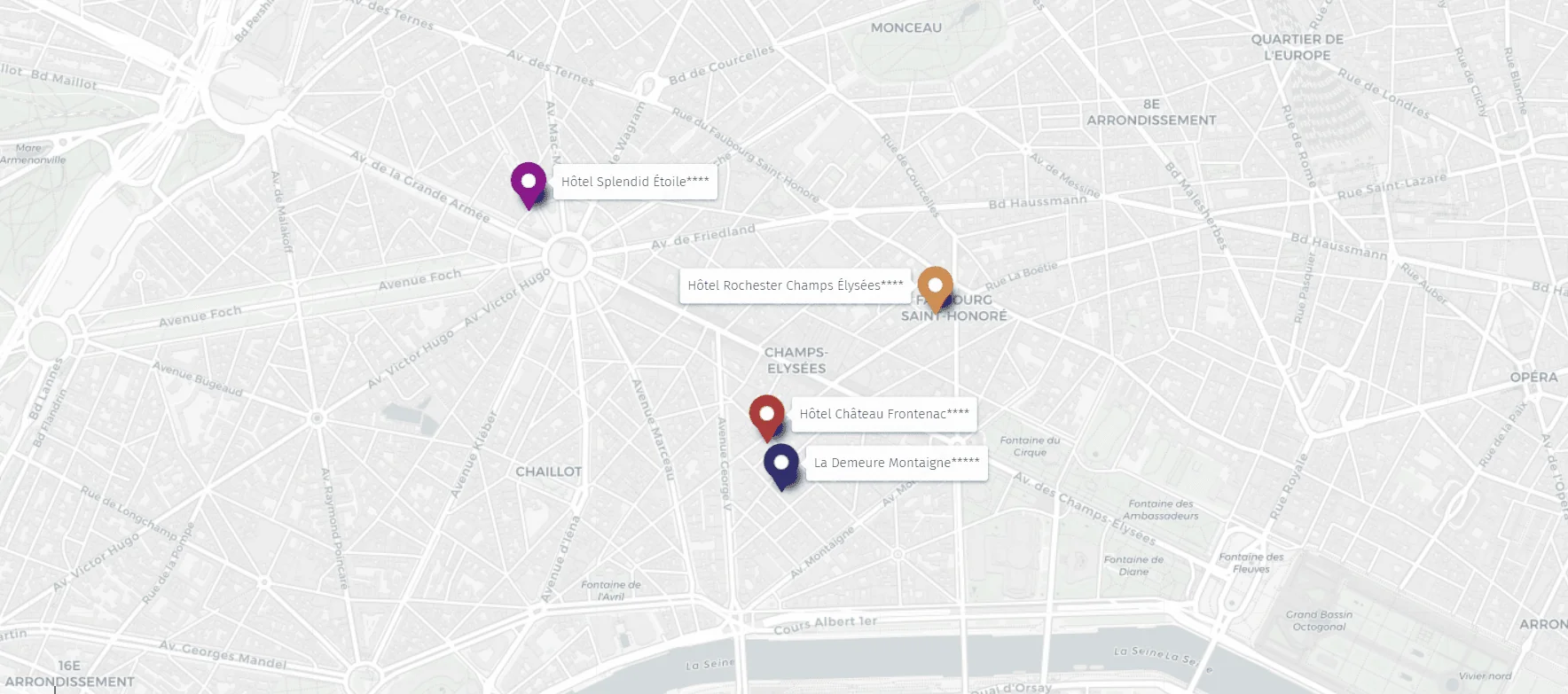 In the prestigious Champs-Elysées district, the Frontenac Group invite you to discover its 4 hotels of charm and character, combining authenticity and modernity, perfect illustration of hotel expertise and French elegance. Our establishments will seduce you throughout your stay, by their attentive welcome and the high quality of their services.